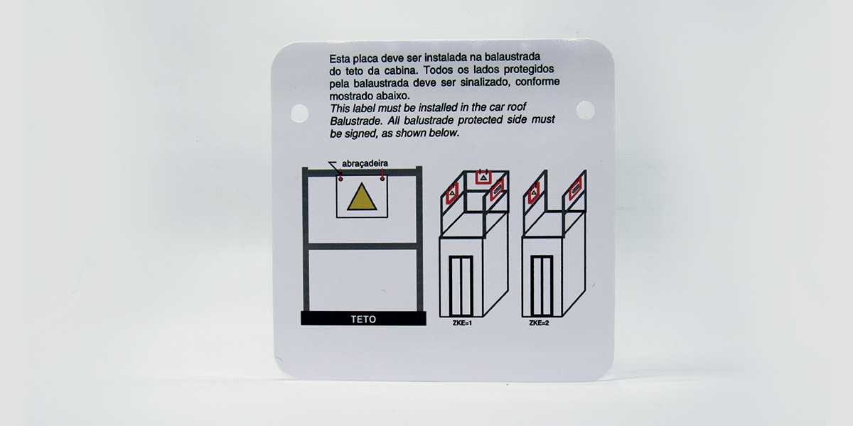 Essas placas informativas são muito utilizadas pelo segmento de mobilidade urbana – elevadores e escadas rolantes – para a identificação e instruções aos técnicos de manutenção dentro da casa de máquinas.
