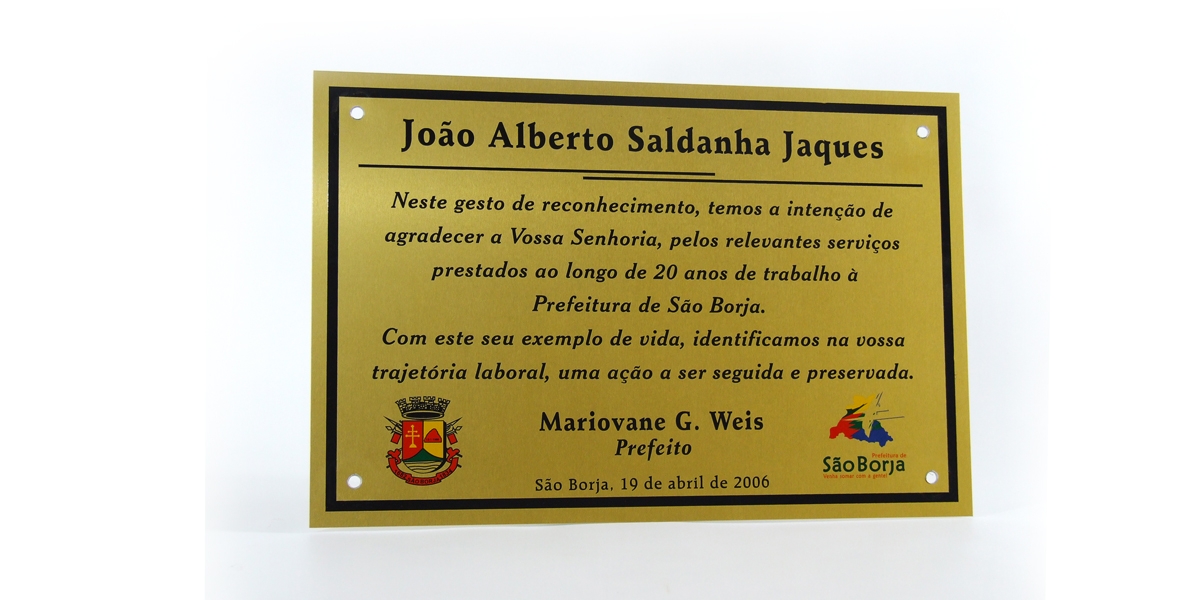 Realizamos a impressão das placas de homenagem e inauguração através de serigrafia, impressão digital ou gravação por corrosão química, de acordo com a necessidade do cliente.
